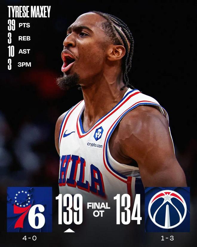 马克西39+10恩比德25分 76人逆转奇才
